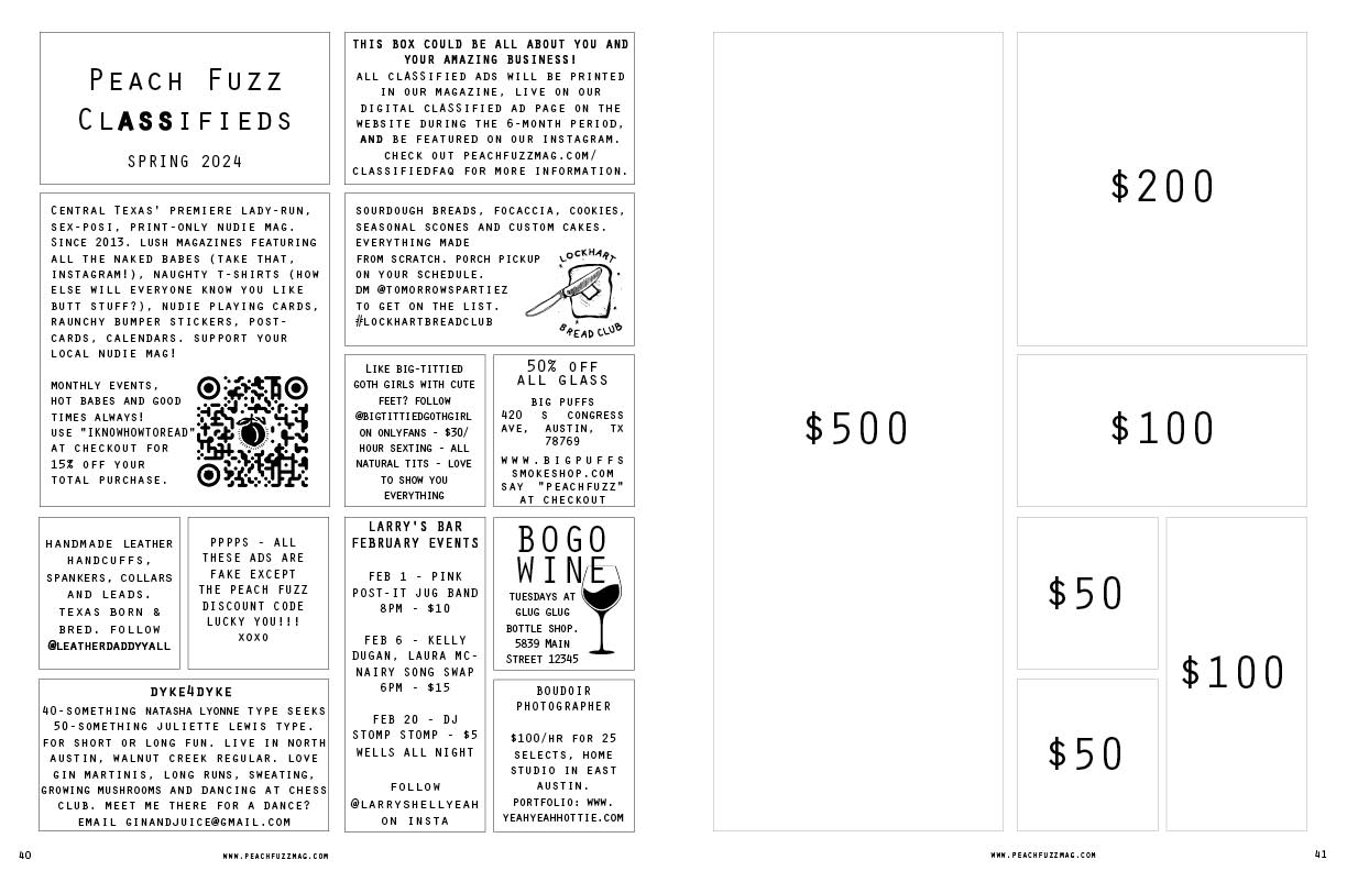 Intended for small businesses, our classified ads are printed in our magazines, as well as displayed on our website, and showcased on our instagram. Just like old school classified ads, printed in the back of the newspaper. Words and black and white logos only. Here is an example spread with prices starting at $50.